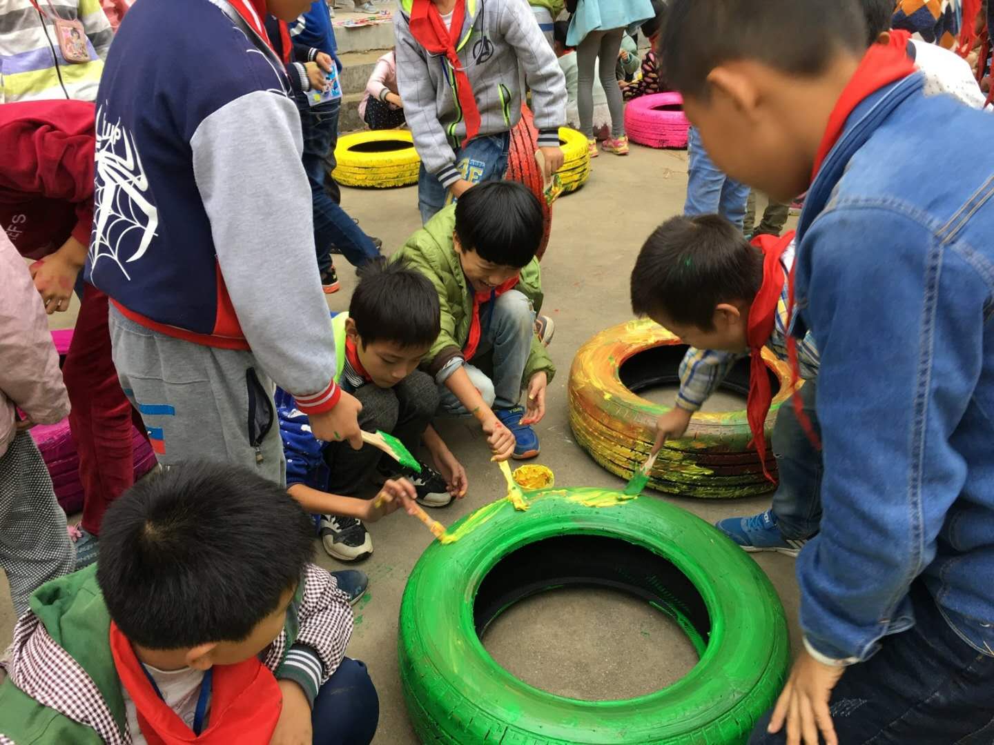 Image 3: China’s rural children from the Jiangxi and Guizhou province decorating old tyres to be re-used as flower pots